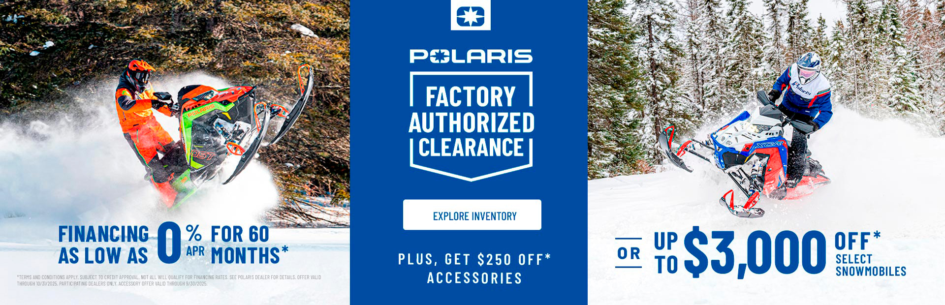 **Promotional finance offers (rates as low as 0.00% for 60 months) valid on only select new 2023-2025 model Polaris snowmobiles purchased from participating authorized U.S. Polaris Snowmobile dealers between August 1st, 2025 – October 31st, 2025. Minimum payments required. Offer may not be combined with certain other offers, is subject to change and may be extended or terminated without further notice. Model specifications subject to change. Model & year exclusions apply. See your local dealer for details. This special finance offer is in lieu of any rebate offers.